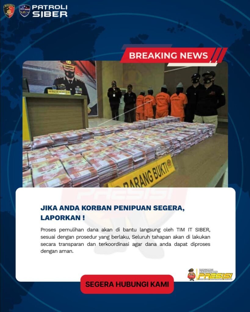 Proses pemulihan dana akan di bantu langsung oleh TIM IT SIBER,sesuai dengan prosedur yang berlaku seluruh tahapan akan di lakukan secara transparan dan terkoordinasi agar dana anda dapat di proses dengan aman.