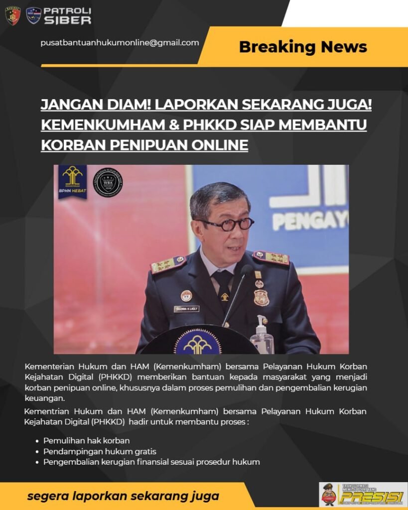 Kementerian Hukum dan HAM ( Kemenkumham) Bersama Pelayanan Hukum Korban kejahatan Digital ( PHKKD ) memberikan bantuan kepada masyarakat yang menjadi korban penipuan online,Kususnya dalam proses pemulihan dan pengembalian kerugian keuangan.